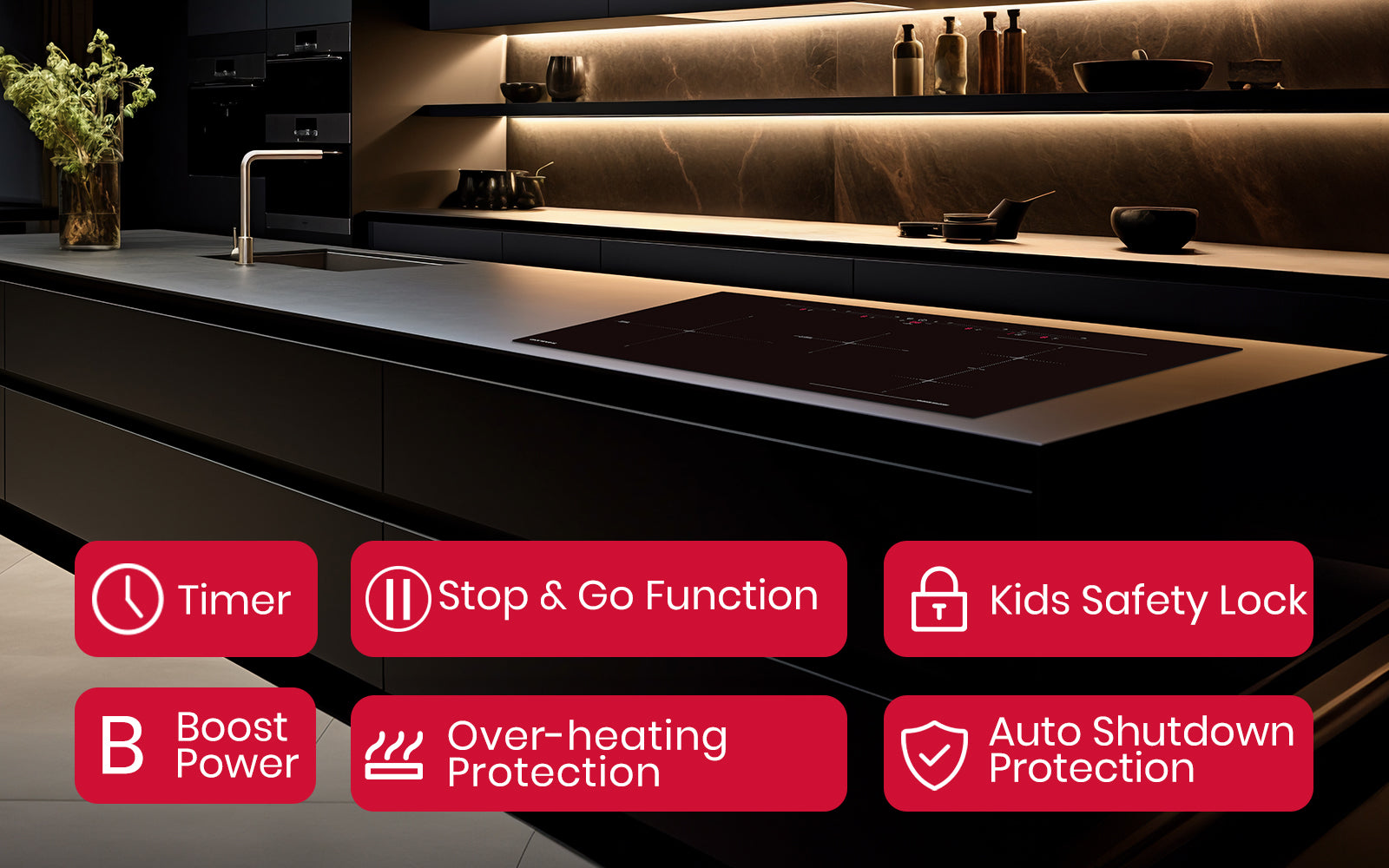 Safety Features: Featuring Child Lock, Over-temperature protection, Auto shut-off, Residual heat indicator, and Pan Detector function. The pan detector will sound an alarm and shut down when a pan is removed without turning off the power.