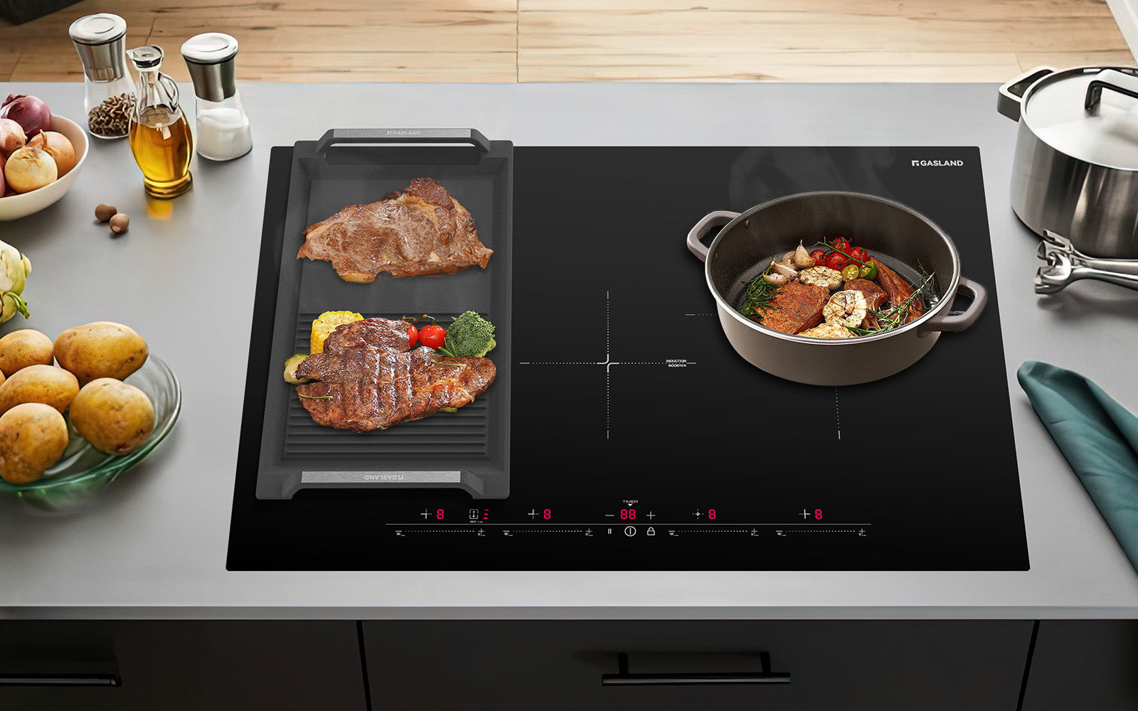 - FlexZone Function: This 77cm induction cooktop is suitable for AC220-240V, with FLEX ZONE that bridges two zones for larger cookware, With the GASLAND 2-in-1 Cast Iron Grill/Griddle, it is simple to enjoy BBQ-style cooking at home.